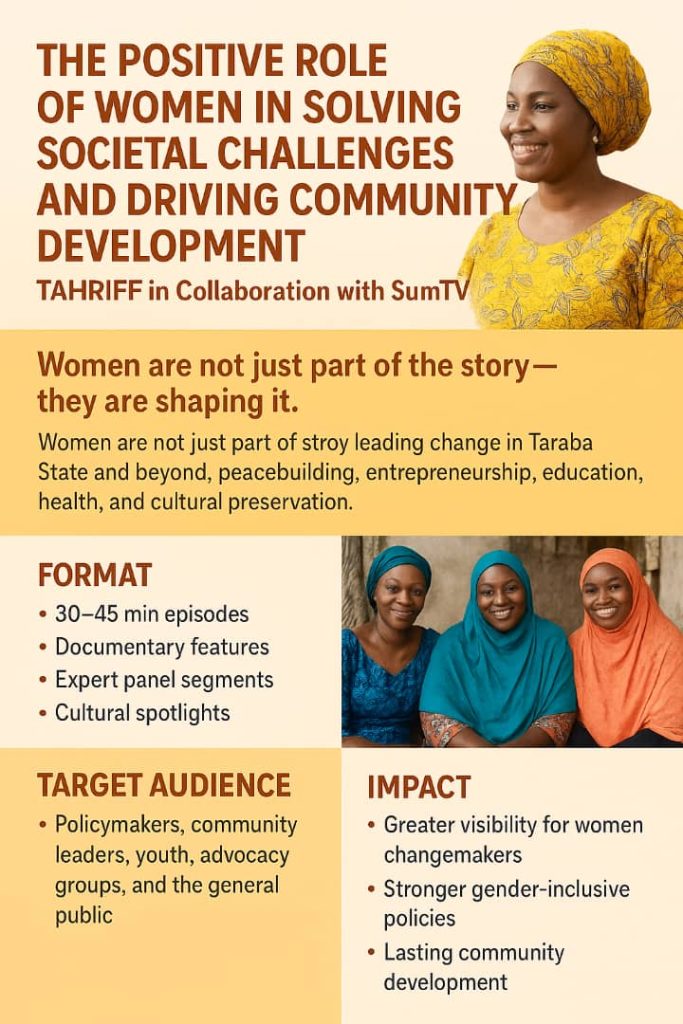The Taraba Human Rights International Film Festival (TAHRIFF), with its focus on restoring human dignity and projecting indigenous creativity, recognizes the urgency of showcasing women’s contributions as both a matter of justice and a catalyst for social change. Collaborating with SumTV, a reputable media platform known for advocacy and humanitarian storytelling, will ensure that these stories are captured authentically and broadcast widely.